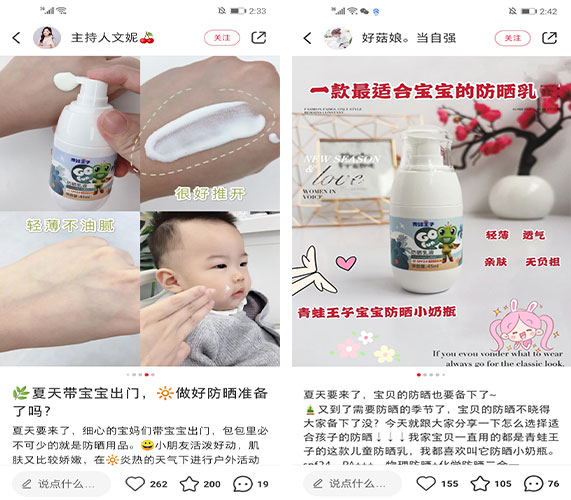 青蛙王子创立于1994年,是儿童个人护理产品的领先国内品牌之一。本次合作是为推广青蛙王子防晒霜产品,采用135位红书腰部、底部母婴博主,就夏日宝宝防晒护肤方向原创图文笔记,植入青蛙王子“防晒小奶瓶”产品,从而对宝妈人群进行精准种草,并引流到青蛙王子天猫店铺。
